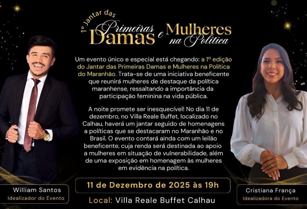 Nesta quinta-feira 11 de dezembro acontece o 1º Jantar das Primeiras-Damas e Mulheres na Política 2025, evento que marca também a 1ª edição do Prêmio Mulheres na Política, na Villa Reale Buffet. A iniciativa é realizada pelo apresentador William Santos, do Jornal O Debate e do Programa Top da TV São Luís afiliada à RedeTV em parceria com a jornalista Cristiana França, e promete ser o maior encontro de lideranças políticas femininas do Maranhão.