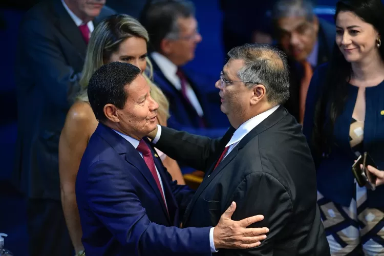 O ministro da Justiça de Lula, Flávio Dino, e o ex-vice de Jair Bolsonaro, Hamilton Mourão, se cumprimentaram calorosamente nesta quarta-feira (1°/2), na posse do novo Senado.