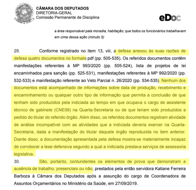 Katiane Ferreira Barboza, a funcionária fantasma, respondeu a Processo Administrativo Disciplinar (PAD) da Câmara dos Deputados por “fraude ao sistema de controle de frequência” da Casa e ganhos “sem a efetiva contraprestação laboral”, entre 30 de setembro de 2019 e 24 de agosto de 2020. No mesmo período em que estava lotada na quarta-secretaria da Casa, ela também trabalhava no Ministério da Saúde.