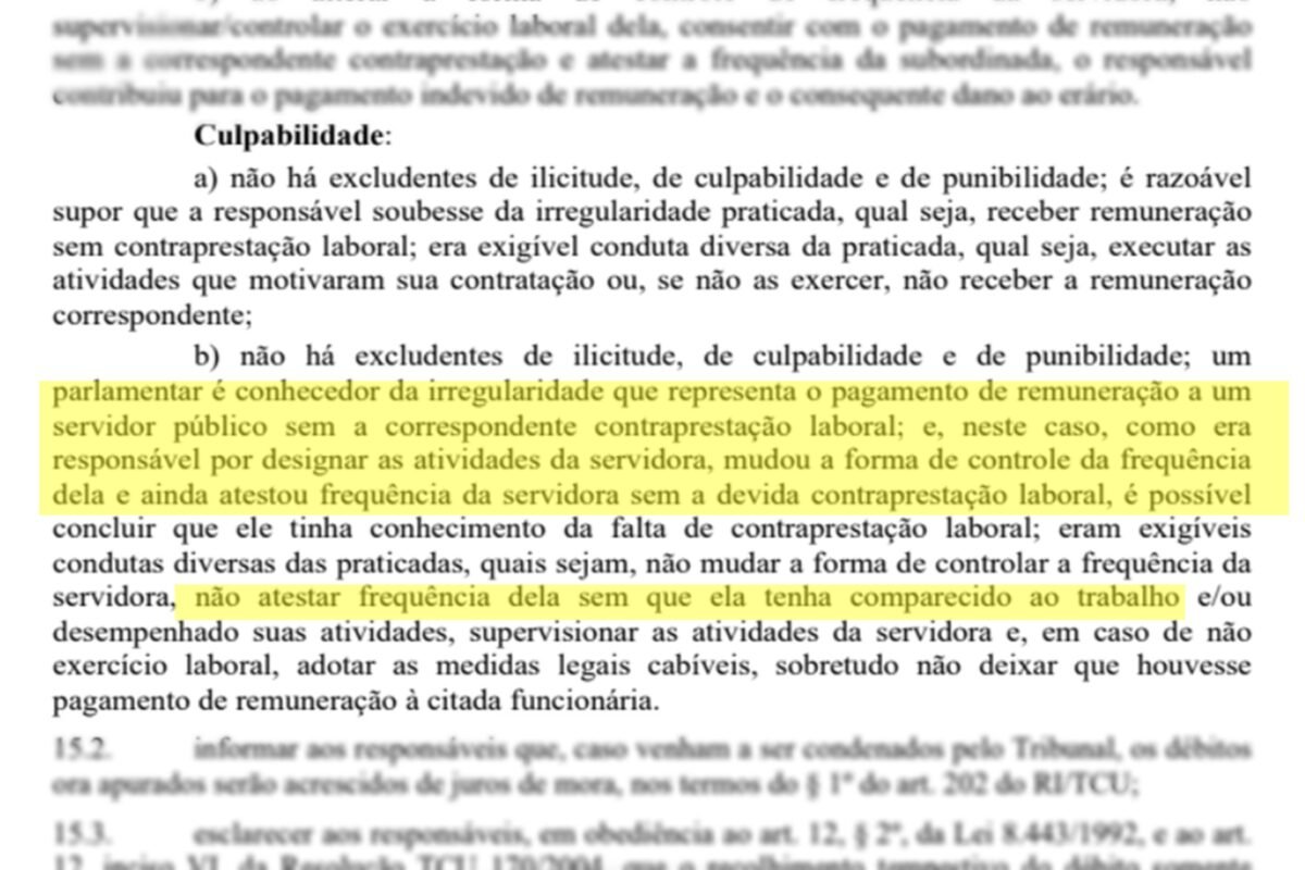 Para a Unidade de Auditoria Especializada em Tomada de Contas Especial, André Fufuca, responsável por nomear a mulher, “contribuiu para o pagamento indevido de remuneração e o consequente dano ao erário”. Nesse sentido, a área técnica listou que o parlamentar teve a seguinte conduta: