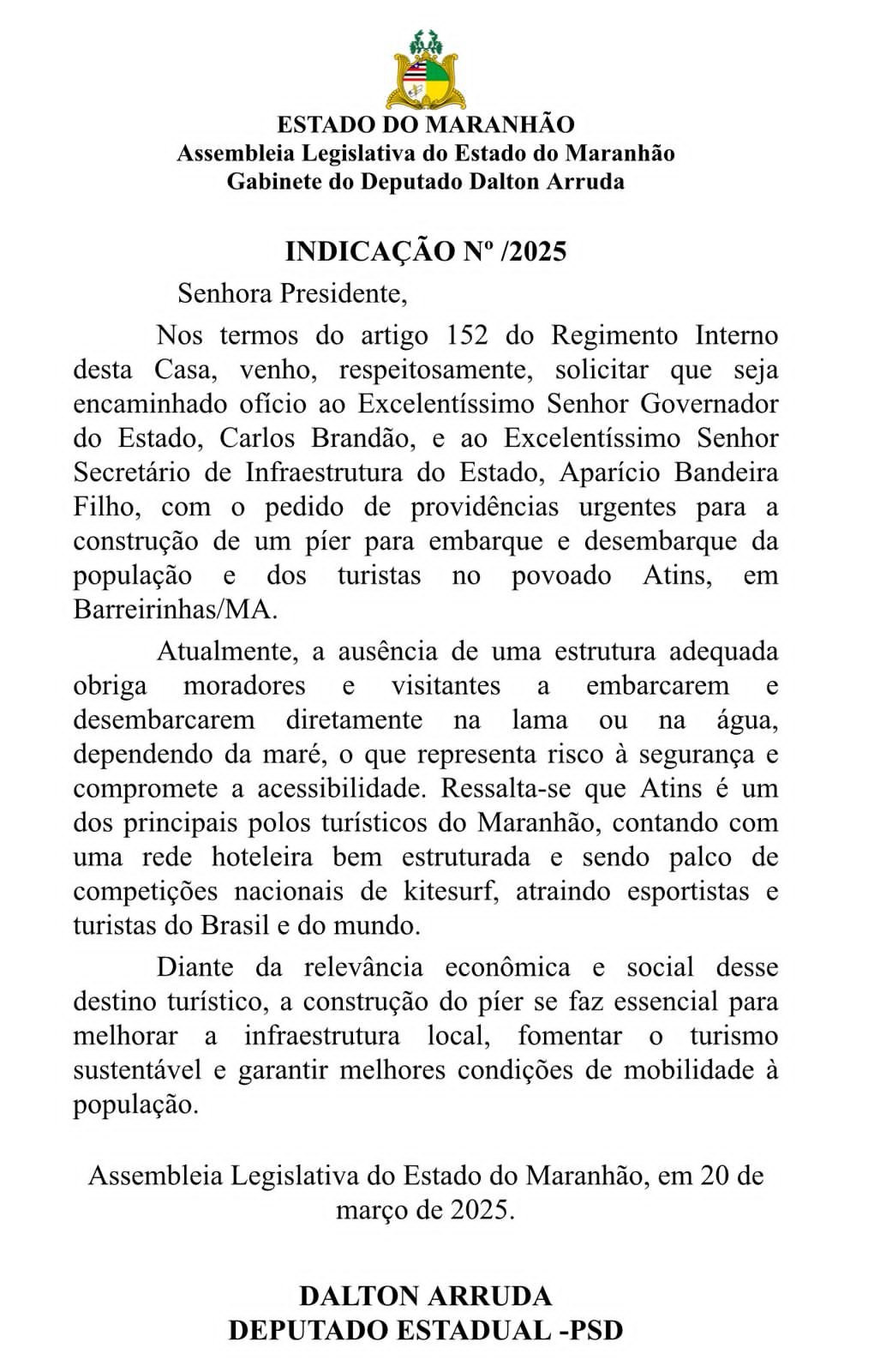 Durante a sua passagem como deputado estadual, o advogado Dalton Arruda apresentou diversas propostas para desenvolver o Maranhão, dentre elas, uma ganhou destaque nesta segunda-feira, 19 de agosto, e evidencia o papel visionário do parlamentar na investidura do cargo. No dia 20 de março desse ano, foi apresentada a Indicação nº 371/2025, solicitando ao Governo do Maranhão, a construção de um píer para embarque e desembarque de moradores e turistas no povoado Atins, em Barreirinhas e em entrevista a Tv Mirante, o governador Carlos Brandão confirmou a realização da obra.