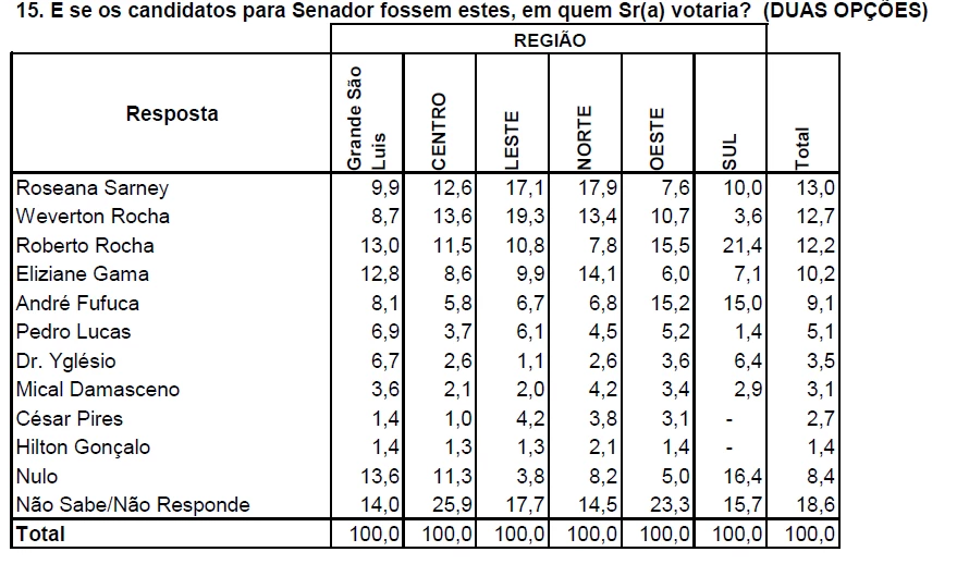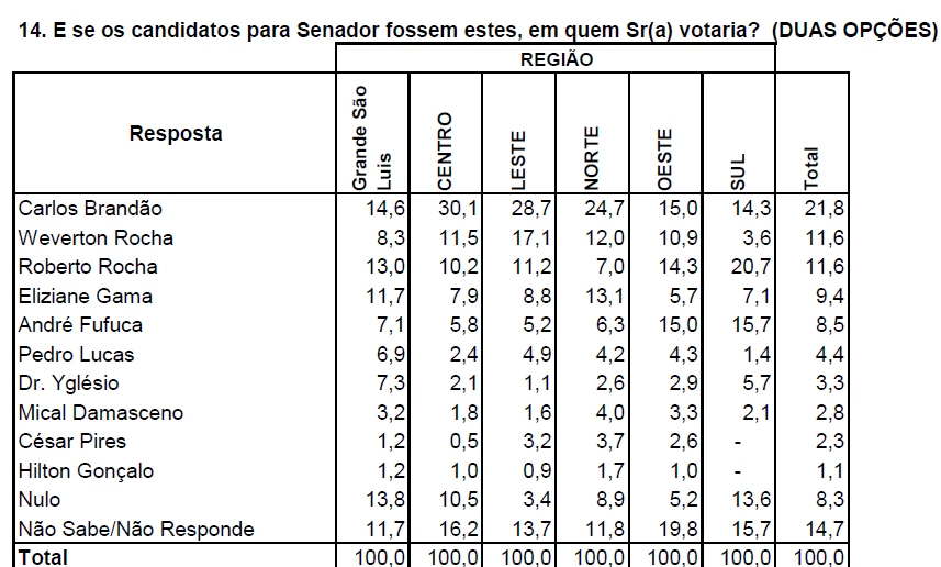 Os cenários são dois. No primeiro, o governador Carlos Brandão (sem partido) lidera a corrida pelo Senado. Ele aparece com 21,8%. Depois aparece o senador Weverton Rocha (PDT) com 11,6% que é o mesmo percentual do ex-senador Roberto Rocha (sem partido).