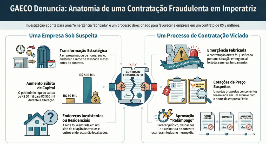 A Denúncia é resultado de Procedimento Investigatório Criminal, com foco em contratações diretas realizadas em 2019, por meio de dispensa de licitação, que culminaram na celebração de contrato com a empresa J. M. de Sousa Eireli, atualmente denominada Fênix Comércio e Serviços Ltda.