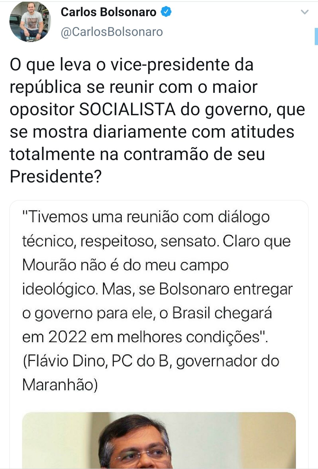 Em seu tuíte, na noite desta sexta-feira (3), Carlos Bolsonaro reproduziu essa fala e insinuou que Mourão está conspirando para derrubar seu pai: “o que leva o vice-presidente da república se reunir com o maior opositor SOCIALISTA do governo, que se mostra diariamente com atitudes totalmente na contramão de seu Presidente?”.
