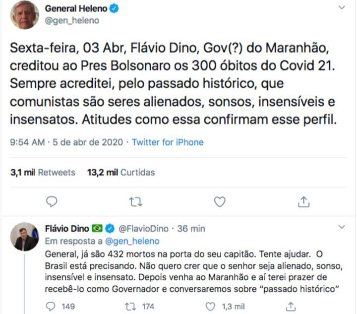 Dino respondeu a Heleno. “General, já são 432 mortos na porta do seu capitão. Tente ajudar. O Brasil está precisando. Não quero crer que o senhor seja alienado, sonso, insensível e insensato. Depois venha ao Maranhão e aí terei prazer de recebê-lo como Governador e conversaremos sobre ‘passado histórico’”.