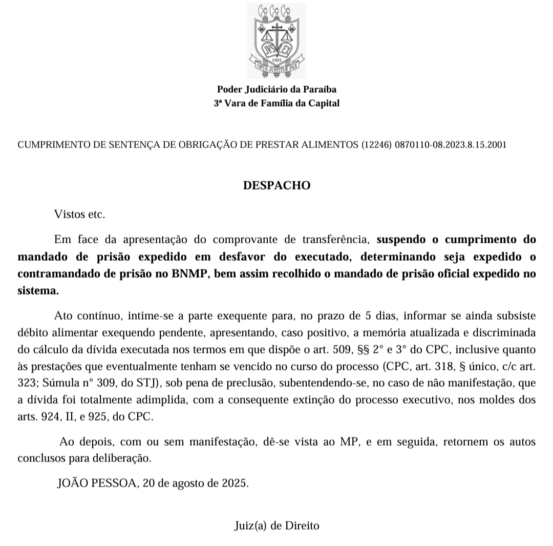 Raul Ribeiro Batista II foi empossado no cargo em abril deste ano e teve o mandado de prisão expedido em junho. Ele é acusado na Justiça de não ter feito o pagamento da pensão em dezembro de 2024. Desde que assumiu o cargo no gabinete de Josivaldo JP, o salário dele é de R$ 2,1 mil, mais R$ 1,7 mil em auxílio. A ordem de prisão em seu nome prevê dois meses de reclusão e depois determina a sua soltura.