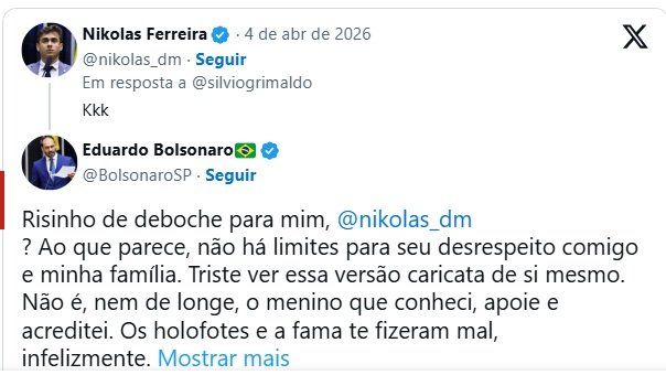 “Risinho de deboche para mim, @nikolas_dm? Ao que parece, não há limites para seu desrespeito comigo e minha família. Triste ver essa versão caricata de si mesmo. Não é, nem de longe, o menino que conheci, apoiei e acreditei”, diz a resposta de Eduardo.