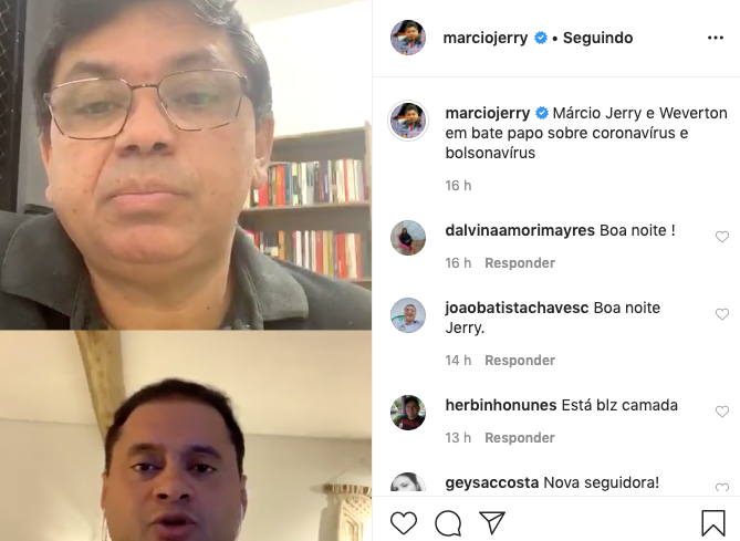 Reunidos virtualmente na noite desta sexta-feira (15), o deputado federal Márcio Jerry (PCdoB) e o senador Weverton Rocha (PDT) concordaram que Jair Bolsonaro (sem partido) já não tem condições de seguir no comando do país. Na live, transmitida nos perfis oficiais do Instagram dos líderes, os parlamentares maranhenses debateram a situação do país no contexto da pandemia do coronavírus, os desafios impostos ao Senado e à Câmara, e concordaram que o presidente brasileiro perdeu a oportunidade de unificar o país na mais grave crise do século.