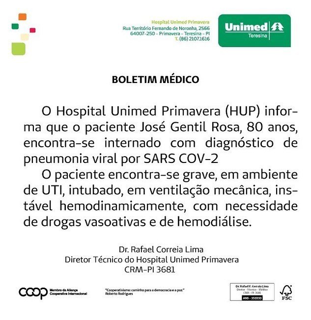 Segundo boletim médico divulgado pelo hospital, o deputado maranhense encontra-se internado com pneumonia viral e intubado em Teresina. Veja o boletim acima.