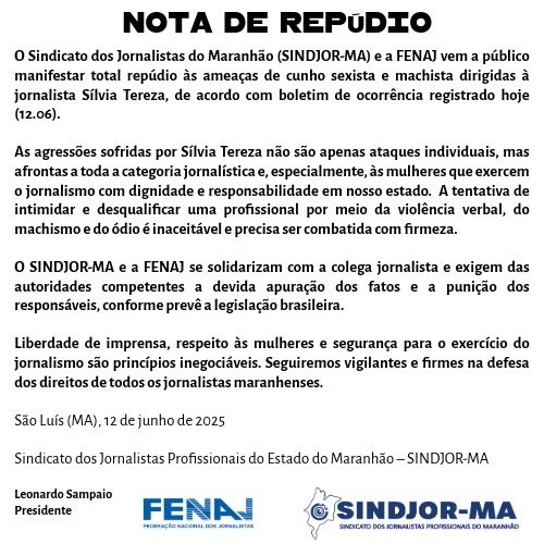 O Sindicato dos Jornalistas Profissionais do Maranhão (SINDJOR-MA) e a Federação Nacional dos Jornalistas (FENAJ) divulgaram, nesta quinta-feira (12), uma nota de repúdio diante das ameaças de cunho sexista e machista sofridas pela jornalista Sílvia Tereza no exercício da profissão. As entidades também cobraram das autoridades competentes a apuração rigorosa dos fatos e a responsabilização dos autores.