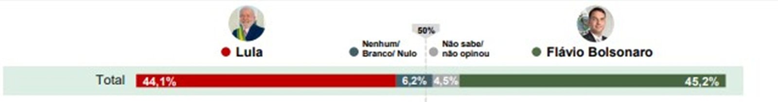 Flávio aparece numericamente à frente de Lula no cenário de 2º turno, em um confronto direto com Lula. De acordo com o levantamento, Flávio tem 45,2%, e Lula,, 44,1%. Contando com a margem de erro de 2,2 pontos, o dois teriam um empate técnico neste cenário. Veja: