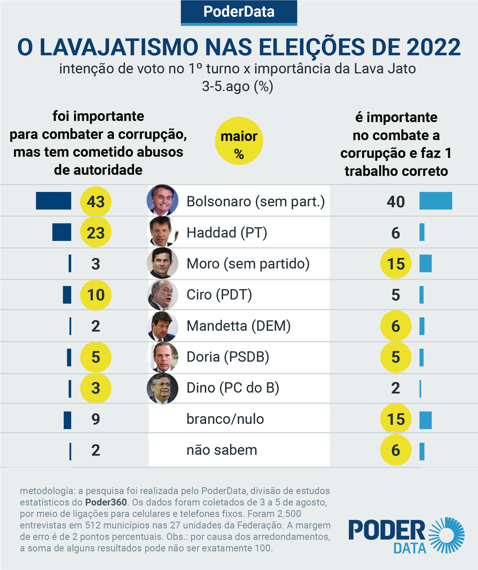 A pesquisa foi realizada pelo PoderData, divisão de estudos estatísticos do Poder360. Os dados foram coletados de 3 a 5 de agosto, por meio de ligações para celulares e telefones fixos. Foram 2.500 entrevistas em 512 municípios, nas 27 unidades da Federação. A margem de erro é de 2 pontos percentuais.