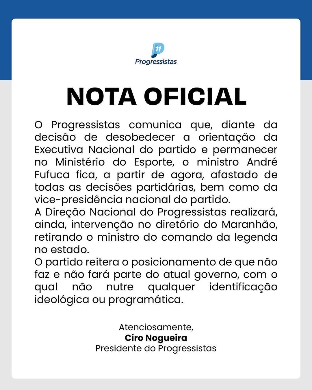 Em nota, Ciro disse que, “diante da decisão de desobedecer a orientação da Executiva Nacional do partido e permanecer no Ministério do Esporte, o ministro André Fufuca fica, a partir de agora, afastado de todas as decisões partidárias, bem como da vice-presidência nacional do partido”. O senador acrescentou que “a Direção Nacional do Progressistas realizará, ainda, intervenção no diretório do Maranhão, retirando o ministro do comando da legenda no estado” e que “não fará parte do atual governo, com o qual não nutre qualquer identificação ideológica ou programática”.