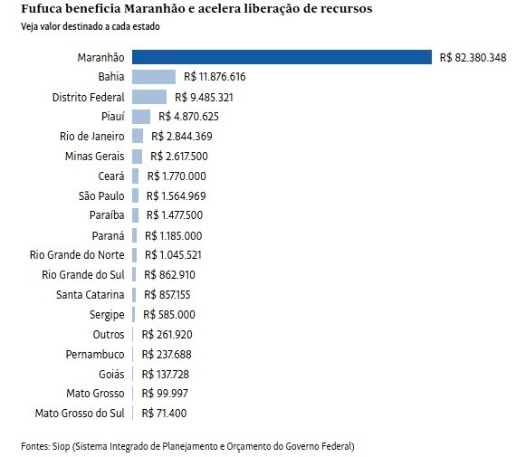 É nesse último bolo que Fufuca tem direcionado os recursos para o Maranhão. Até o início de outubro, o dinheiro separado para investimentos em seu estado natal deve viabilizar 78 obras nos municípios maranhenses.