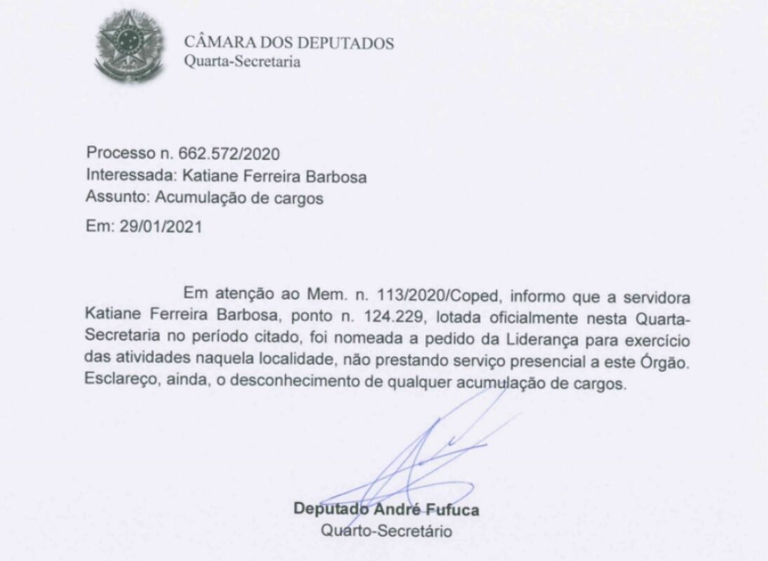 André Fufuca era quarto-secretário da Mesa Diretora da Câmara dos Deputados quando nomeou Katiane Barboza para trabalhar nessa instância da Casa, responsável pela gestão dos apartamentos funcionais e concessão de auxílio-moradia aos parlamentares. Ela tinha remuneração de R$ 14 mil.