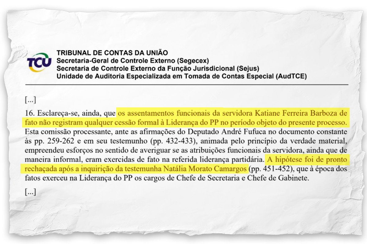 Para embasar essa responsabilização de Fufuca, os auditores do TCU destacaram, entre outros pontos, o depoimento da chefe de gabinete da Quarta-Secretaria, e também da ex-chefe de gabinete da Liderança do PP. A área técnica destacou um trecho do relatório da Comissão de Processo Administrativo que disse que Katiane Barboza nunca trabalhou na liderança partidária. “Hipótese foi de pronto rechaçada após a inquirição da testemunha Natália Morato Camargos”.