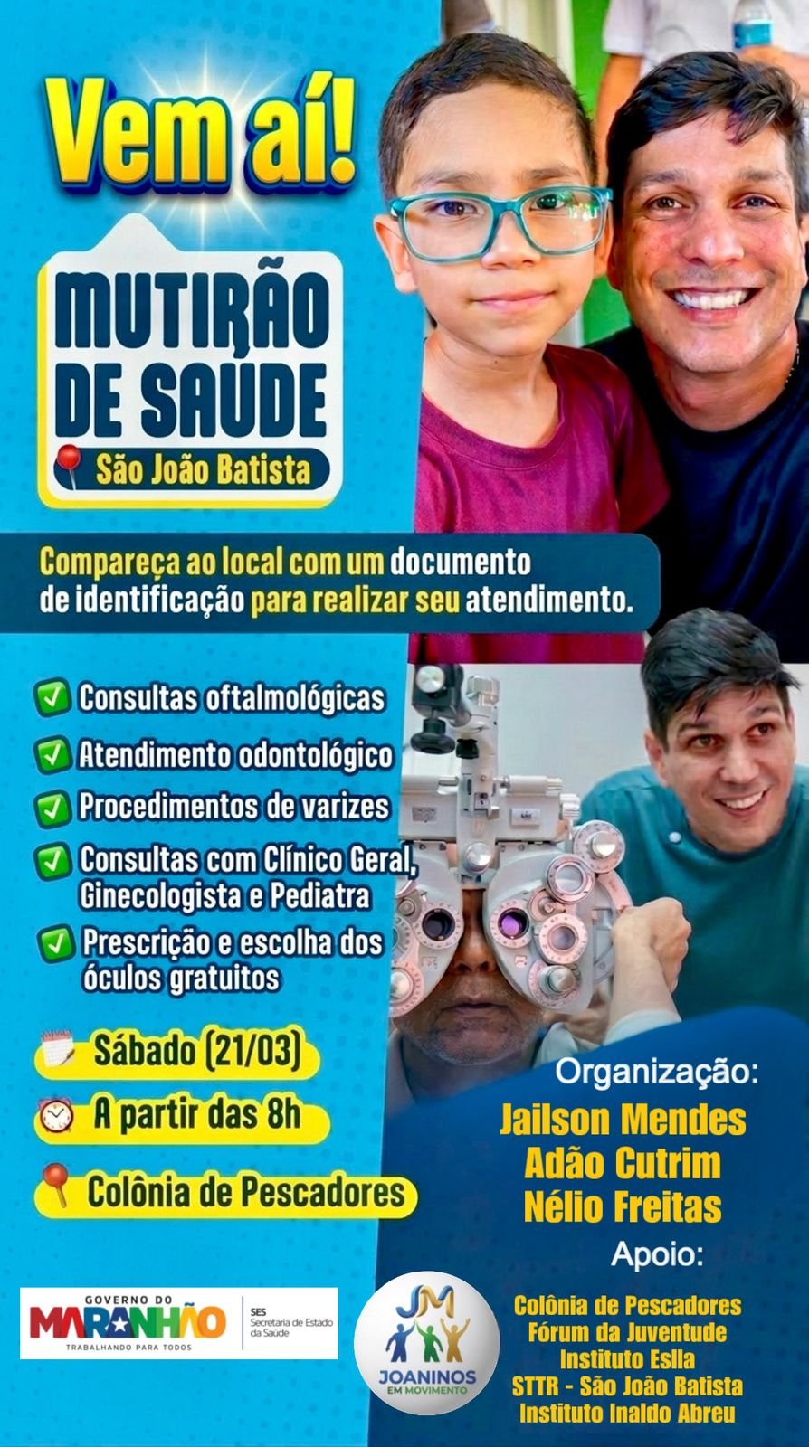 A população de São João Batista terá acesso a uma série de serviços gratuitos de saúde neste sábado (21), durante a realização de um mutirão promovido pelo grupo Joaninos em Movimento (JM), liderado pelos jovens Jailson Mendes, Adão Cutrim e Nélio Freitas, em parceria com a Secretaria de Estado da Saúde do Maranhão, sob o comando do secretário Tiago Fernandes.