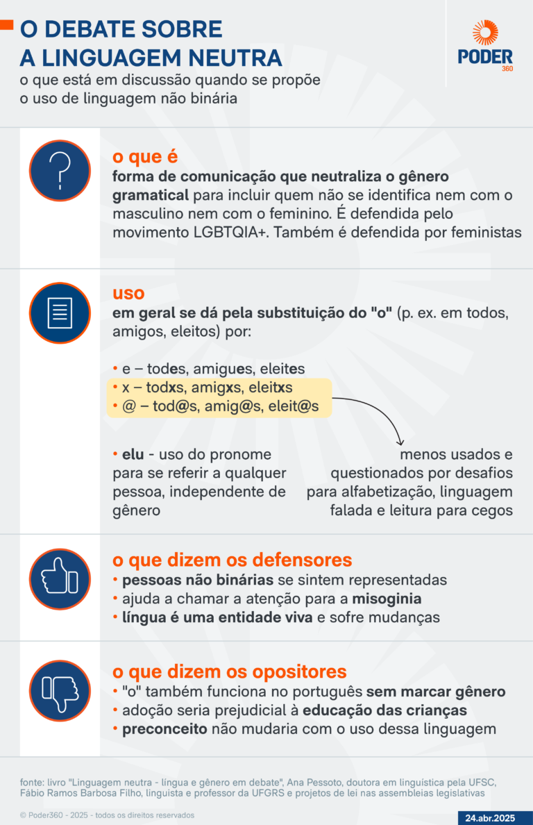 O presidente Luiz Inácio Lula da Silva (PT) sancionou a Lei nº 15.263/2025, que proíbe o uso de linguagem neutra na administração pública em todos os níveis, como a União, Estados e municípios. A regra determina que órgãos públicos sigam a norma culta da língua portuguesa, impedindo o uso de expressões como “todes”, “elu” e outras variáveis. A decisão foi publicada no DOU (Diário Oficial da União) na 2ª feira (17.nov.2025).