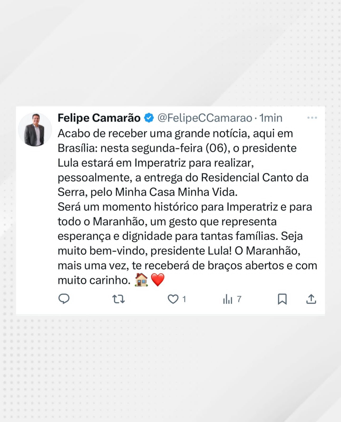 “Acabo de receber uma grande notícia, aqui em Brasília: nesta segunda-feira (06), o presidente Lula estará em Imperatriz para realizar, pessoalmente, a entrega do Residencial Canto da Serra, pelo Minha Casa Minha Vida”, informou o vice-governador Felipe Camarão(PT).
