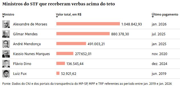 Moraes foi quem recebeu os maiores valores ao longo do período analisado. O ministro, que trabalhou como promotor de Justiça de 1991 a 2002, recebeu ao todo mais de R$ 1 milhão líquido do MP-SP (Ministério Público do Estado de São Paulo) de 2019 a 2026.