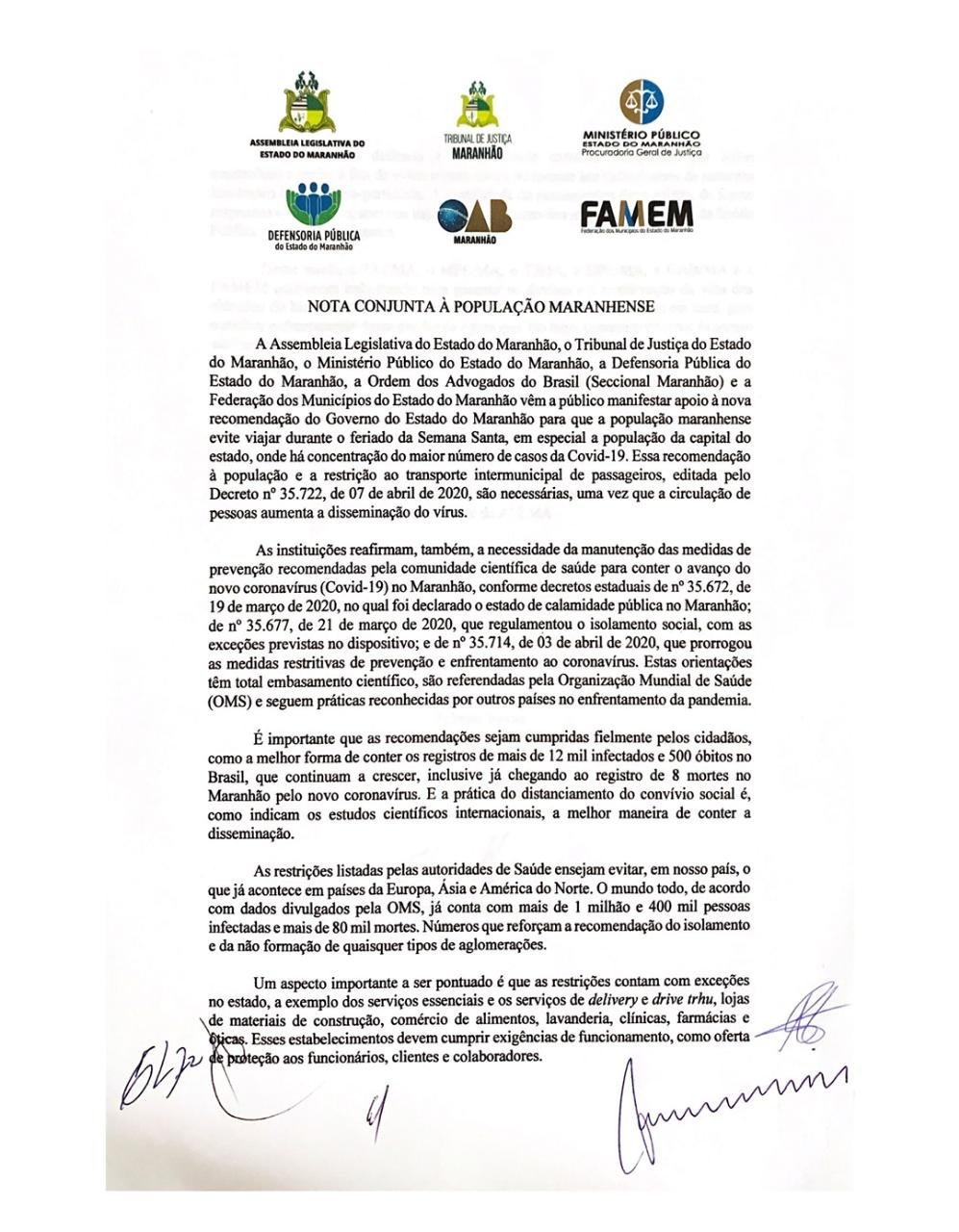 Além do chefe do Legislativo, o documento intitulado ‘Nota conjunta à população maranhense’ foi assinado pelo presidente do Tribunal de Justiça do Estado, desembargador José Joaquim Figueiredo dos Anjos; procurador-geral de Justiça do Estado, Luiz Gonzaga Martins Coelho; pelo presidente da Famem, Erlanio Xavier; defensor-geral do Estado, Alberto Bastos, e pelo presidente da OAB-MA, Thiago Diaz.