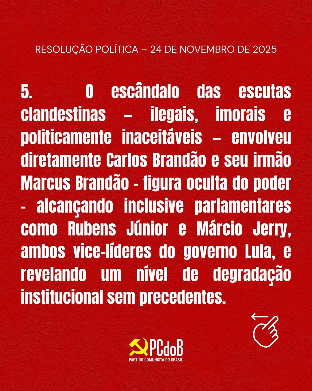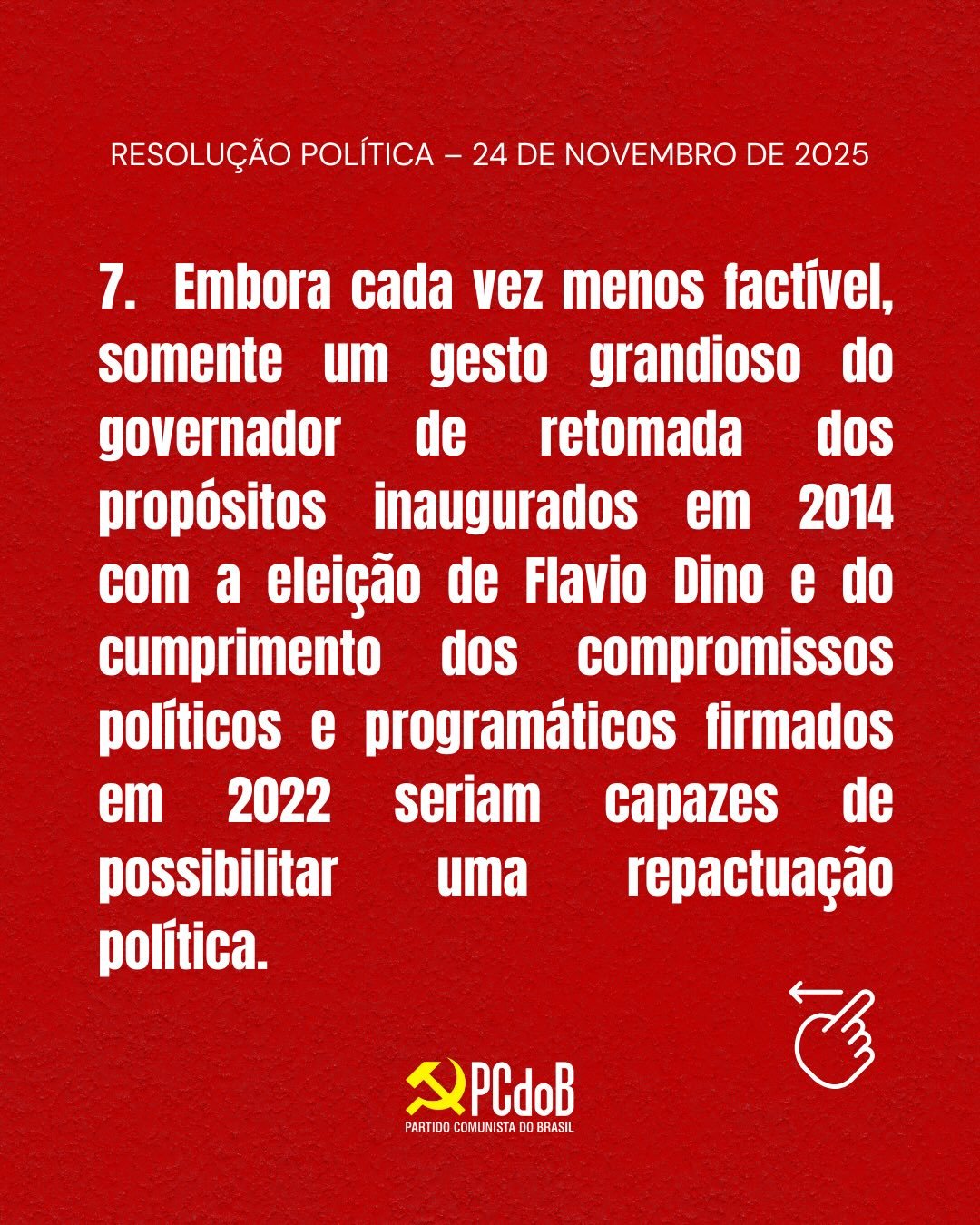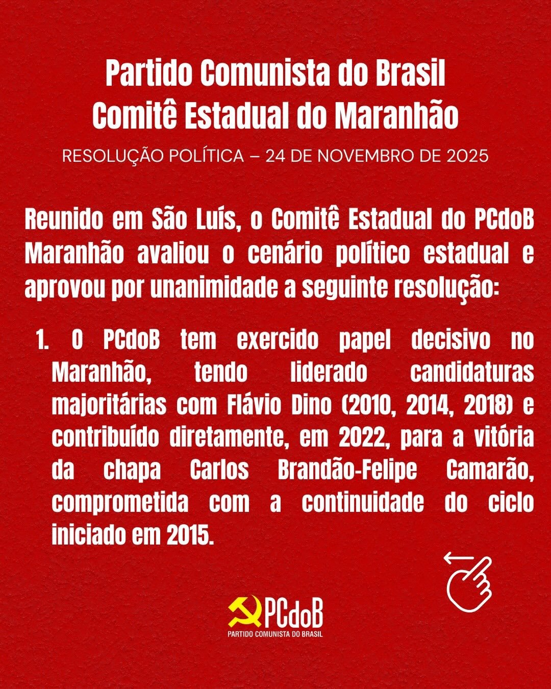 Na reunião, o PCdoB aprovou resolução onde ainda deixa em aberto possibilidade de repactuação com o governador Carlos Brandão desde que haja o cumprimento de compromissos políticos e programáticos. O partido ainda ocupa a Secid no governo. Veja abaixo.