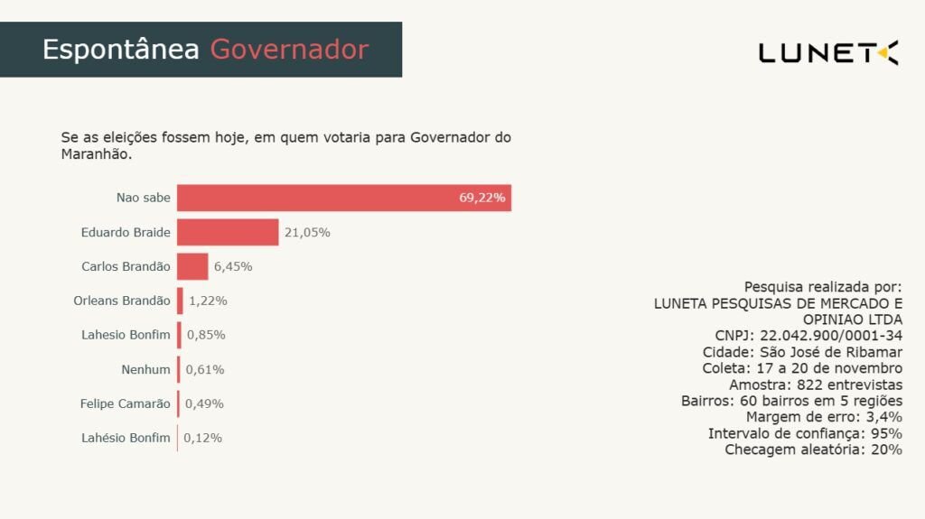 A pesquisa ouviu 822 pessoas em São José de Ribamar entre os dias 17 e 20 de novembro. A margem de erro é de 3,4 pontos percentuais para mais ou para menos, com um nível de confiança de 95%. Isso significa que, tecnicamente, os resultados refletem a intenção de voto da população do município naquele período.