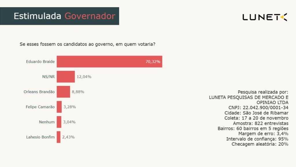 Uma pesquisa realizada pelo Instituto Luneta no município de São José de Ribamar, o terceiro maior colégio eleitoral do Maranhão, revela o prefeito de São Luís, Eduardo Braide (PSD), com uma liderança vantajosa em cenários simulados para a disputa pelo governo do estado em 2026.