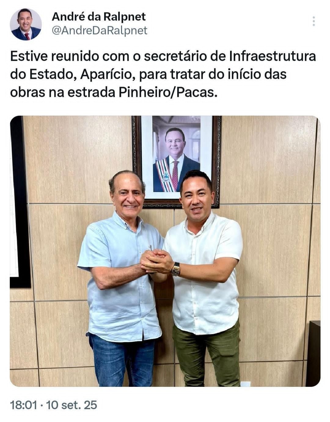 Nesta quarta-feira (10), o prefeito André da Ralpnet se reuniu com o secretário de Infraestrutura do Estado, Aparício Bandeira, para alinhar os detalhes sobre o início das obras da estrada que dará acesso ao bairro Pacas.