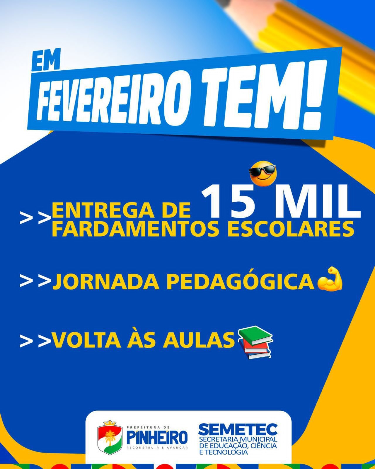 A Prefeitura Municipal de Pinheiro, por meio da Secretaria Municipal de Educação, anunciou nesta terça-feira (20) três importantes projetos que serão executados no mês de fevereiro: a entrega de 15 mil fardamentos escolares aos alunos da rede municipal, a realização da Jornada Pedagógica, com foco no planejamento escolar, e o início do ano letivo.