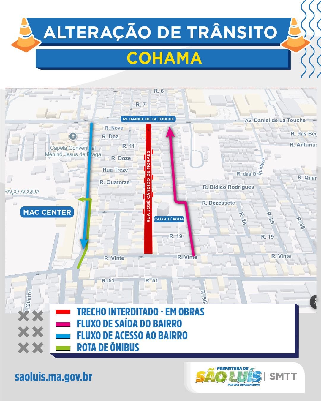 A Secretaria Municipal de Trânsito e Transportes (SMTT) comunica uma alteração temporária no trânsito da Cohama, a partir desta quinta-feira (9). A Rua José Cândido de Moraes estará interditada para o tráfego de veículos, em virtude de obras a serem realizadas pela Caema.