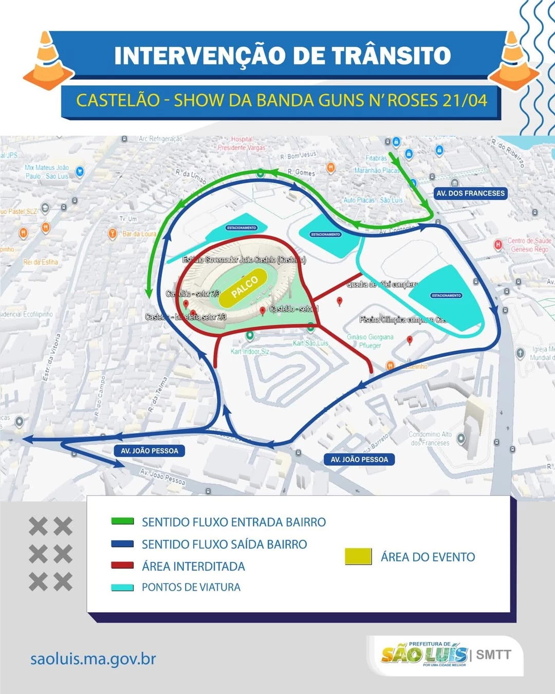 O trânsito será alterado no entorno do Estádio Castelão, nesta terça-feira (21), segundo informações da Secretaria Municipal de Trânsito e Transportes de São Luís, devido ao show da banda Guns N’ Roses.