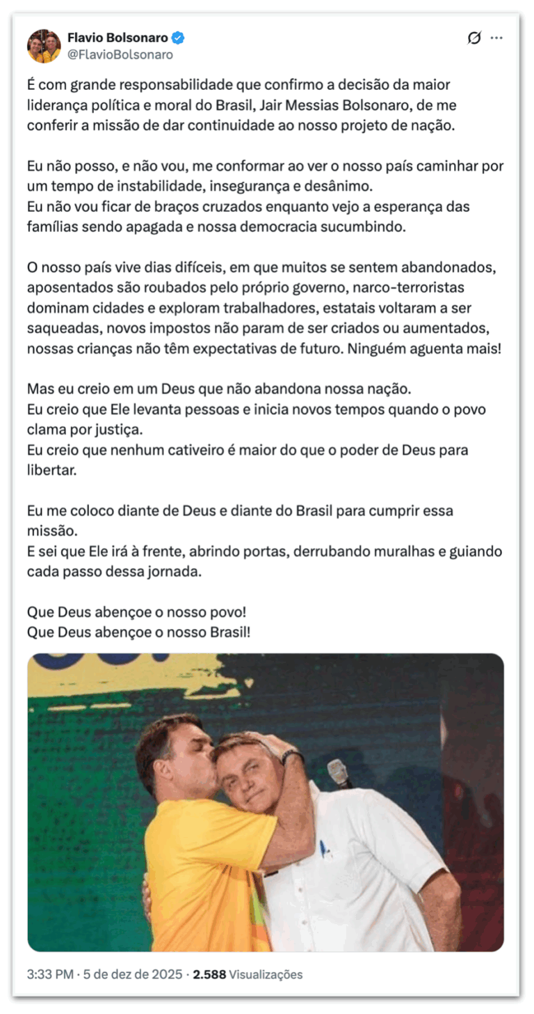 Em seu perfil no X, o senador confirmou a decisão do pai. “É com grande responsabilidade que confirmo a decisão da maior liderança política e moral do Brasil, Jair Messias Bolsonaro, de me conferir a missão de dar continuidade ao nosso projeto de nação”, escreveu.
