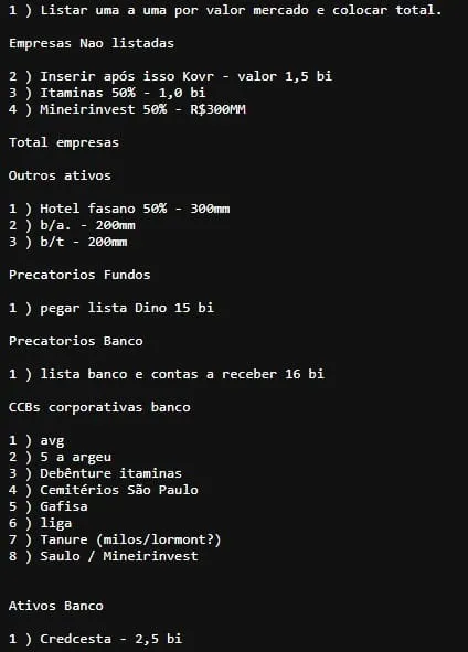 O registro faz parte de um conjunto de anotações financeiras que detalha empresas listadas por valor de mercado e outros ativos. O material inclui precatórios de fundos e bancos, com valores a receber que superam R$ 16 bilhões, além de Cédulas de Crédito Bancário (CCBs) corporativas e ativos da instituição. No trecho que relacionado a “precatórios fundos”, há uma anotação “pegar lista Dino 15 bi”.